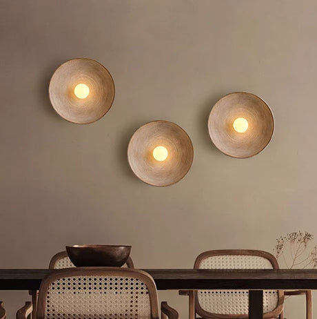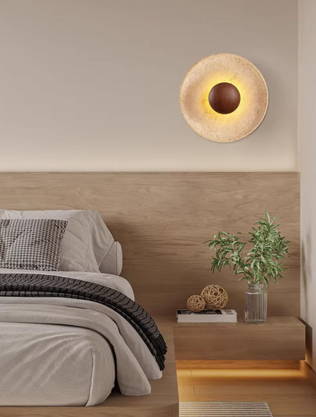 מנורת קיר טרה – אבן טבעית ועץ כהה | LED | קוטר 25 ס״מ