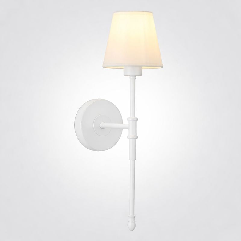 מנורת קיר מתכת בצבע לבן אהיל בד, מתאים לסוג נורה E27.