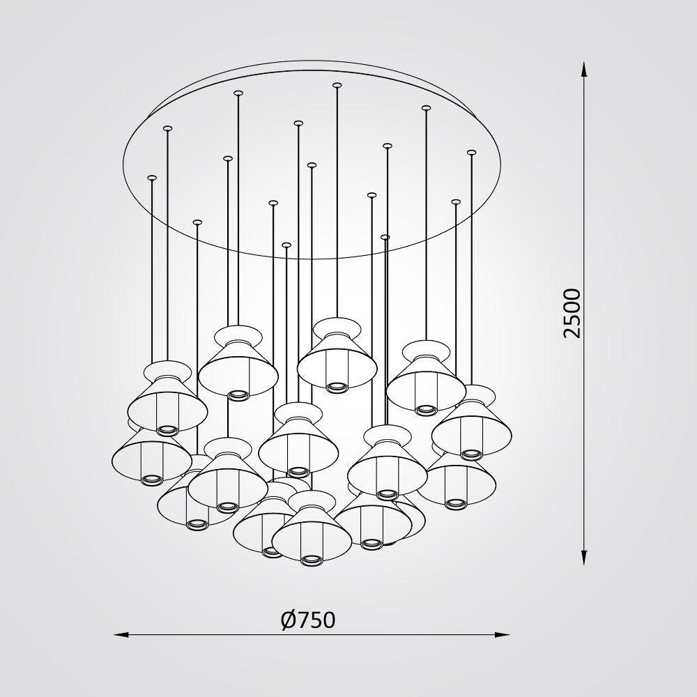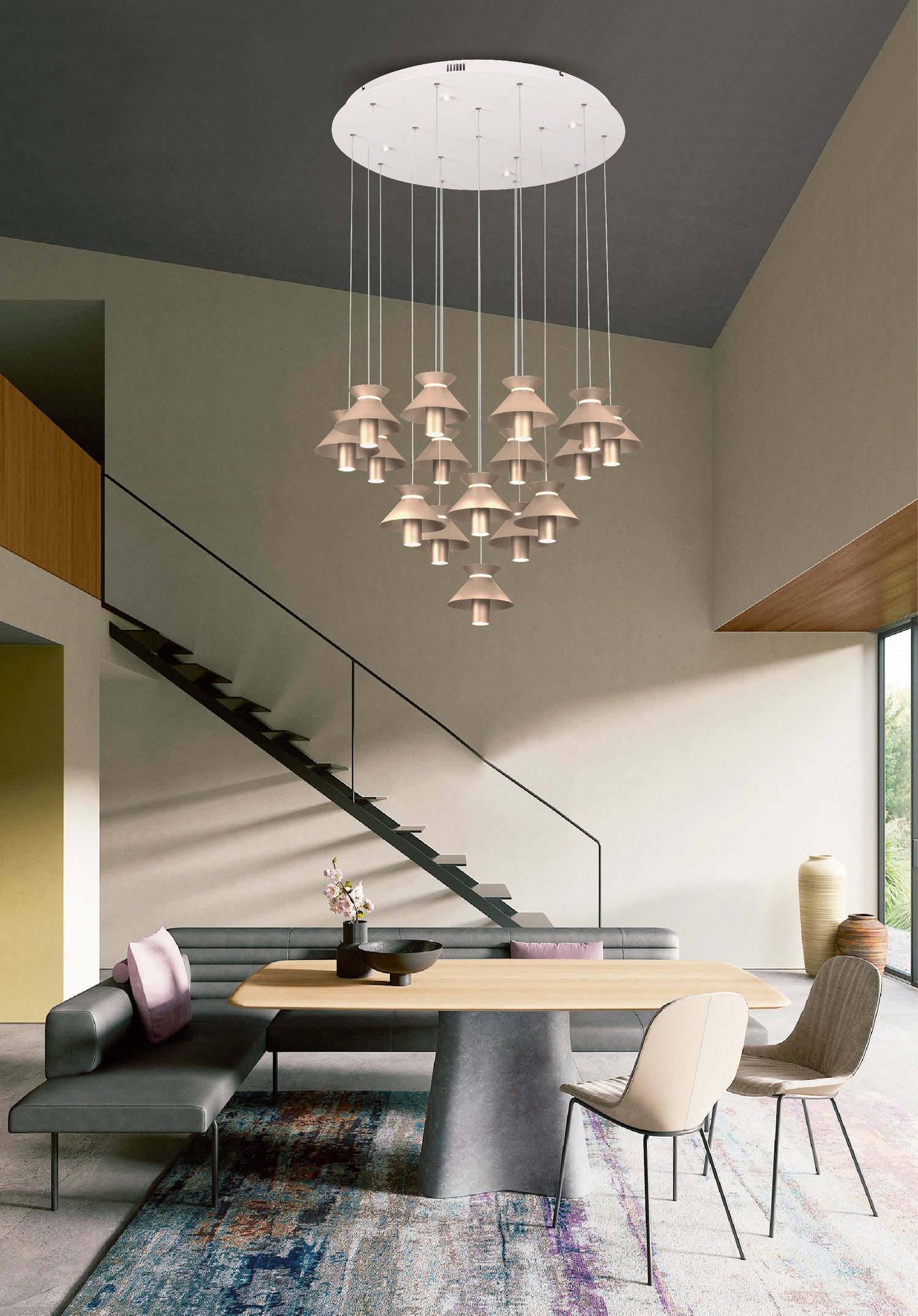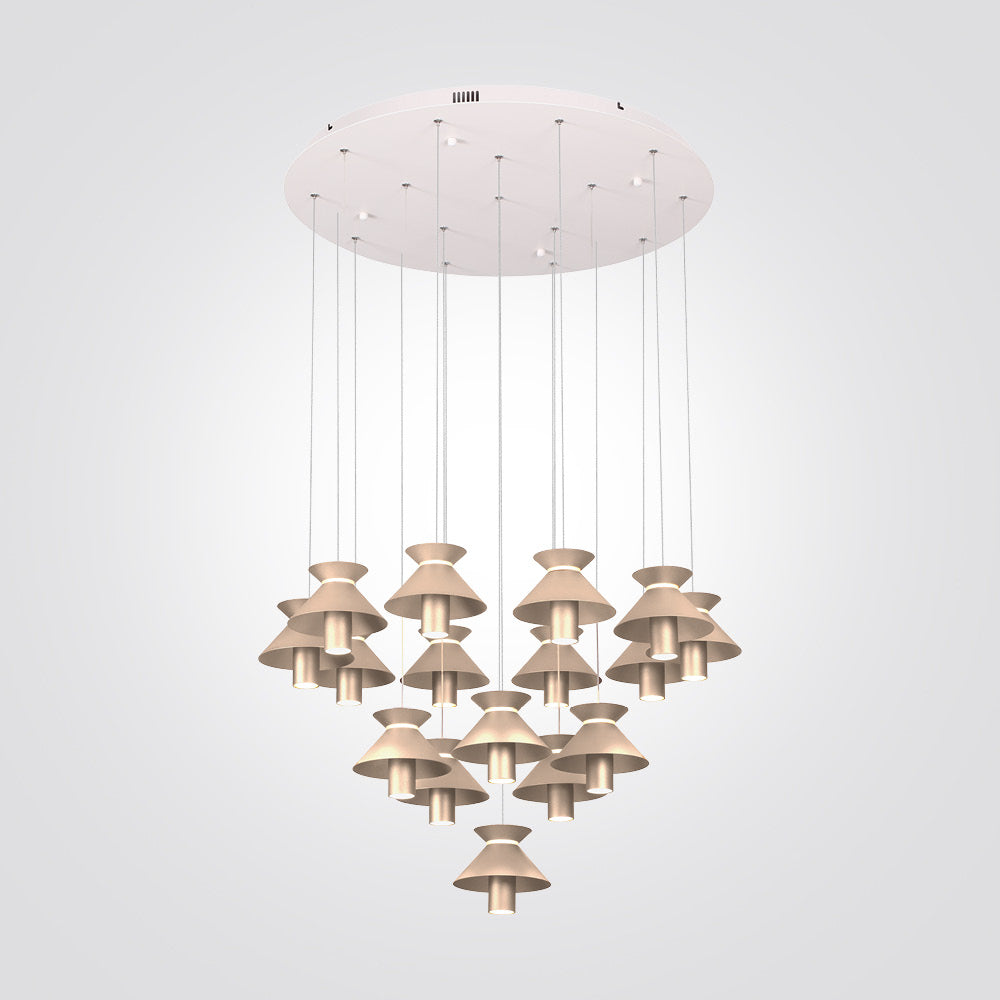 נורת תלייה LED מעוצבת עם 16 ראשי תאורה, הגוף עשוי אלומיניום ואקריליק, עם ראשי תאורה בגימור Pale Gold ובסיס בגימור לבן מט, המנורה מפיקה אור חם בגוון 3000K.