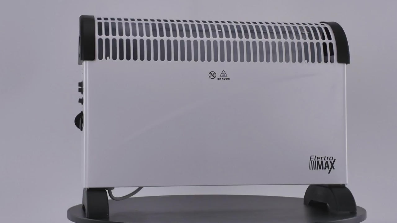 מחמם קונווקטור בצבע לבן, טורבו מובנה להאצת פיזור האוויר החם. ניתן להציבו על רגליים יציבות או לתלות על קיר (קיט כלול), וידית נשיאה.