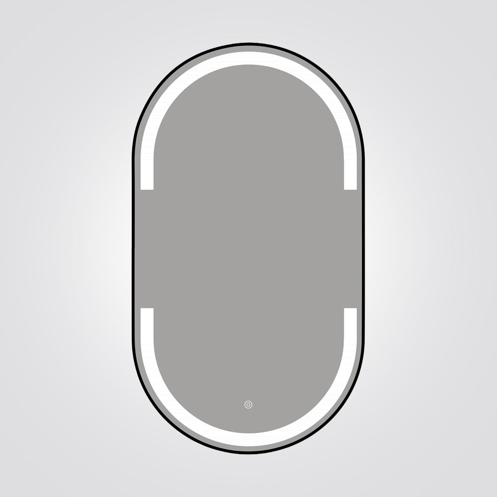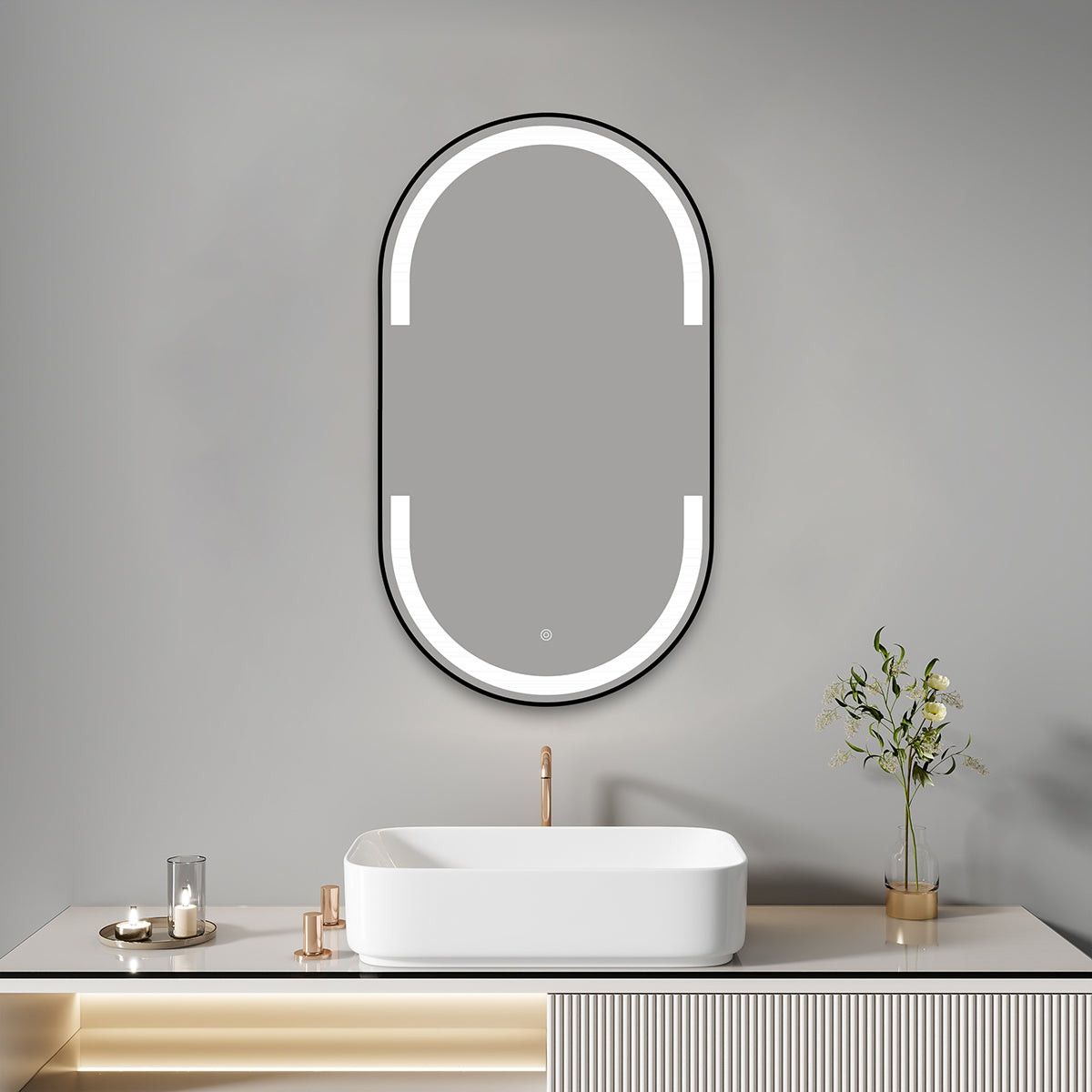 מראה אובלית , זכוכית בעובי 4 מ״מ עמידה בלחות, פס LED יוצר הילה מוארת סביב השפה. לוח הטאץ׳ מאפשר לבחור בין שלושה גווני אור (3000 K חם, 4000 K טבעי ו-6000 K קר), לעמעם את העוצמה, להפעיל/לכבות +מפשיר האדים. כבל עם תקע באורך 1 מ׳.