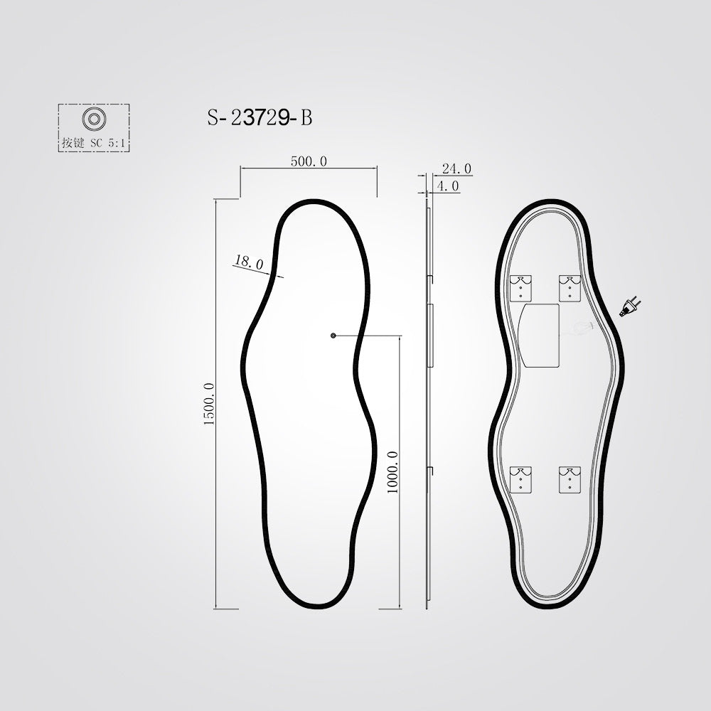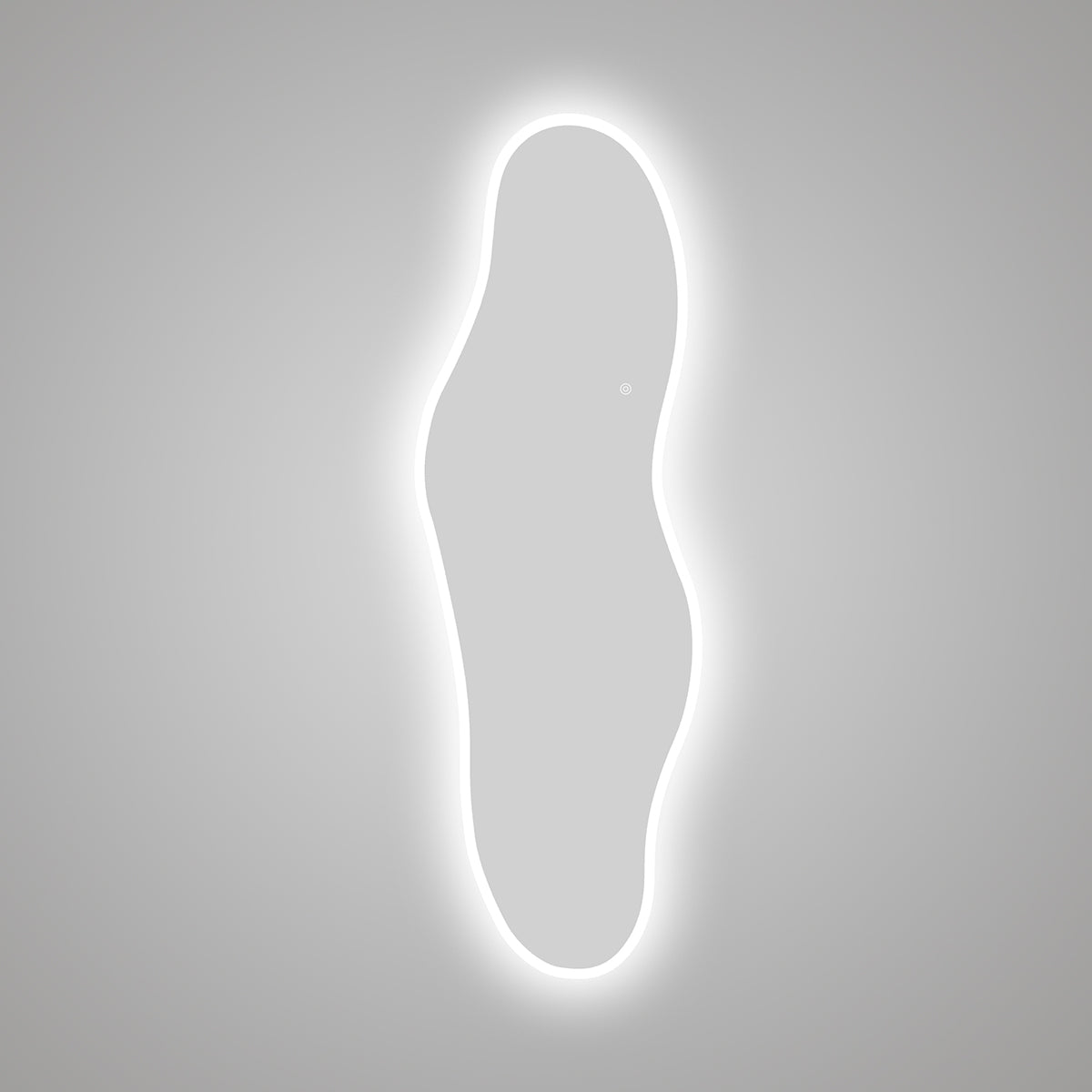 מראת LED בצורת Freeform לא סימטרית. המראה בגובה 150 ס״מ וברוחב 50 ס״מ זכוכית נטולת בעובי 4 מ״מ, תאורת LED שלושה גווני אור (3000K/ 4000K / 6000K) עם עמעום בלחיצת טאץ׳. כבל ותקע באורך 1 מ׳