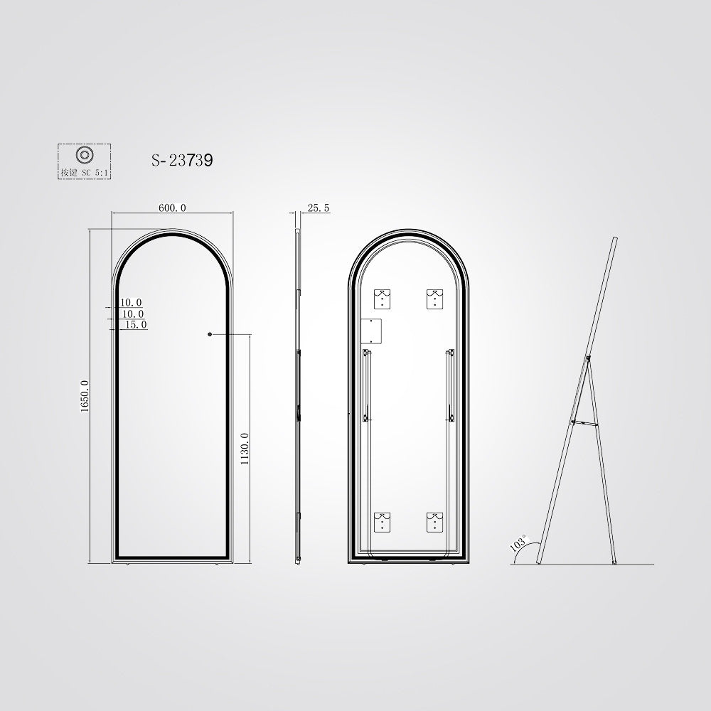מראת גוף בעיצוב קשת עם מסגרת זהב. המראה מצוידת בתאורת LED מובנית עם אפשרות לבחירת שלושה גווני אור ( 3000K / 4000K / 6000K) ושליטה על עוצמת התאורה באמצעות מתג מגע חכם.