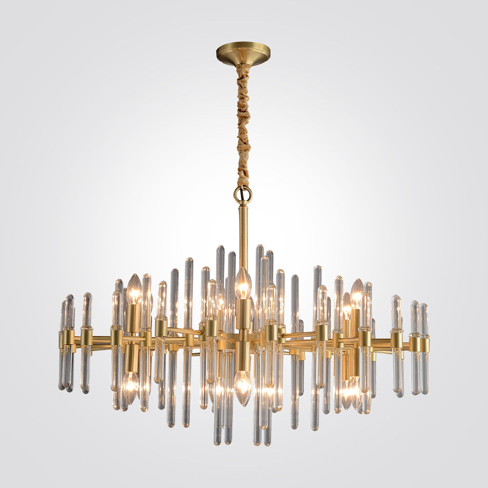 מנורת תלייה קריסטל בעיצוב יוקרתי, בגימור זהב עם זכוכית שקופה, מתאים לנורות E14. מושלמת לתקרות גבוהות, סלון ופינת אוכל.