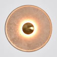 מנורת קיר עגולה ומרשימה בעיצוב אומנותי, משלבת גוף מתכת בגימור זהב מוברש עם לוח טראוורטין בגוון צהבהב טבעי.