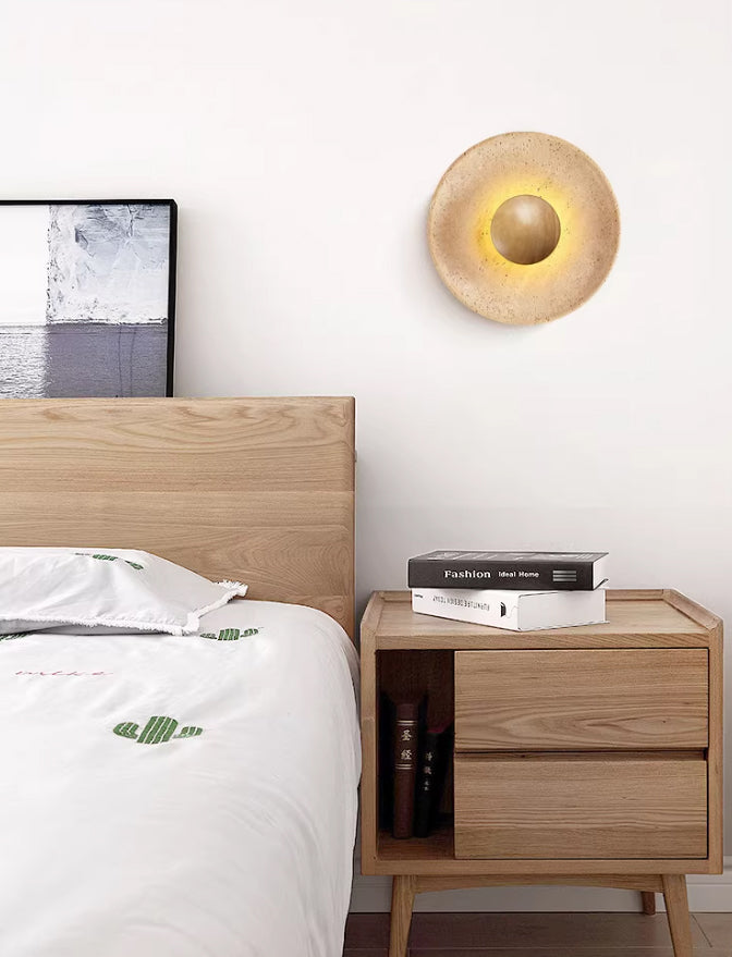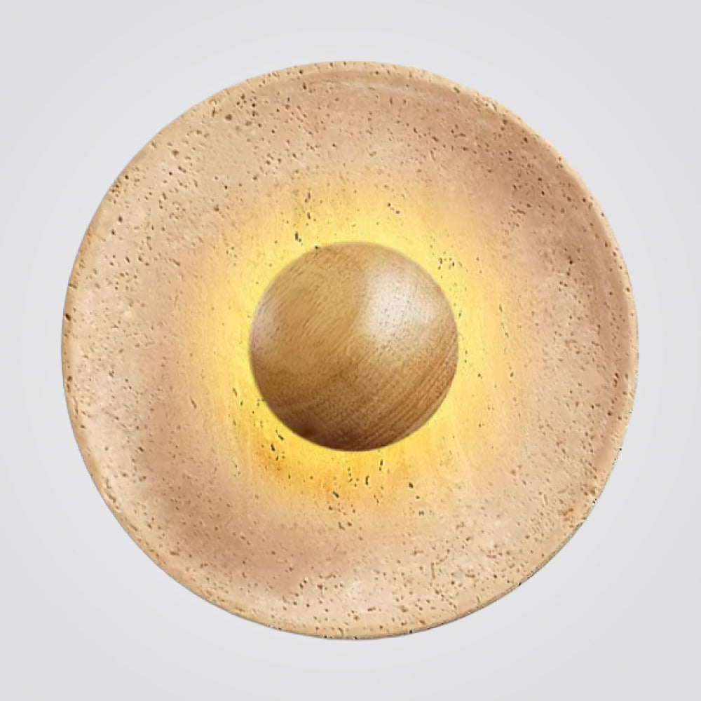 מנורת קיר טרה – אבן טבעית ועץ בהיר | LED | קוטר 25 ס״מ