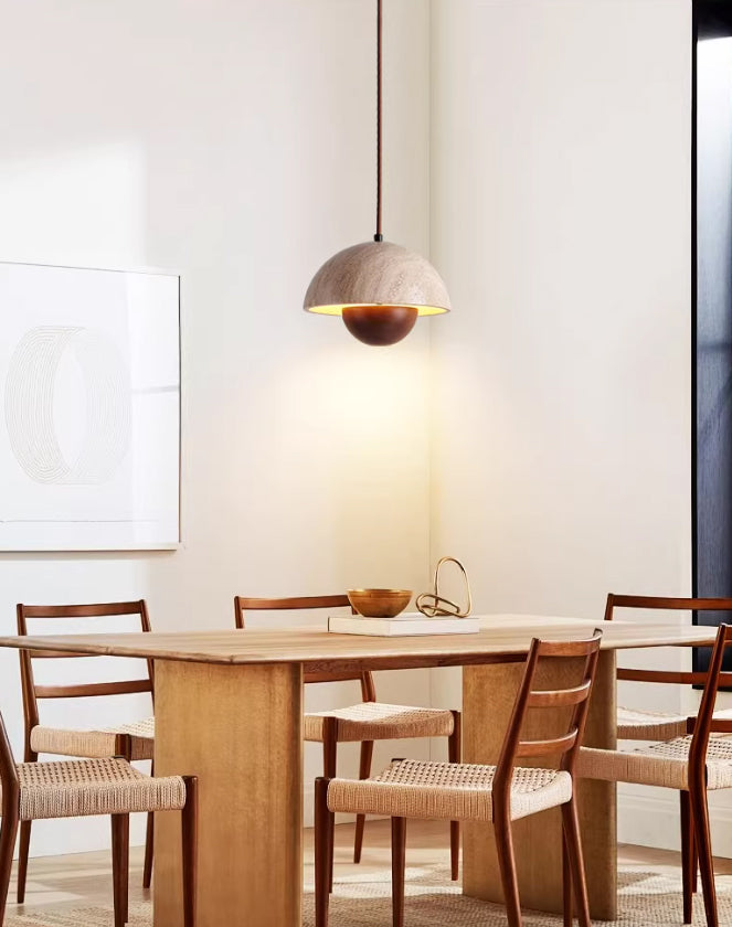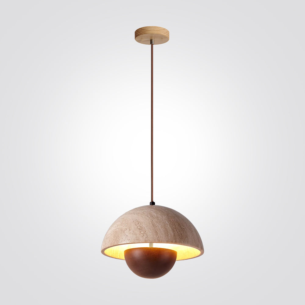 מנורת תלייה רוקה בעיצוב טבעי ואלגנטי המשלבת אבן טרוונטין טבעית עם עץ בהיר.